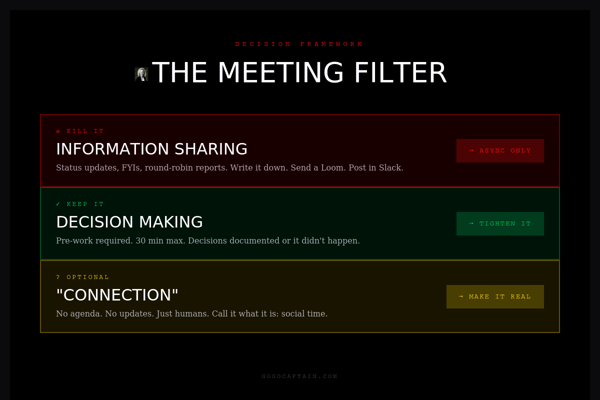 If the meeting is for information sharing → KILL IT. Write it down. Send a Loom. Post in a channel. People consume information faster when they’re not trapped in a conference room pretending to care.